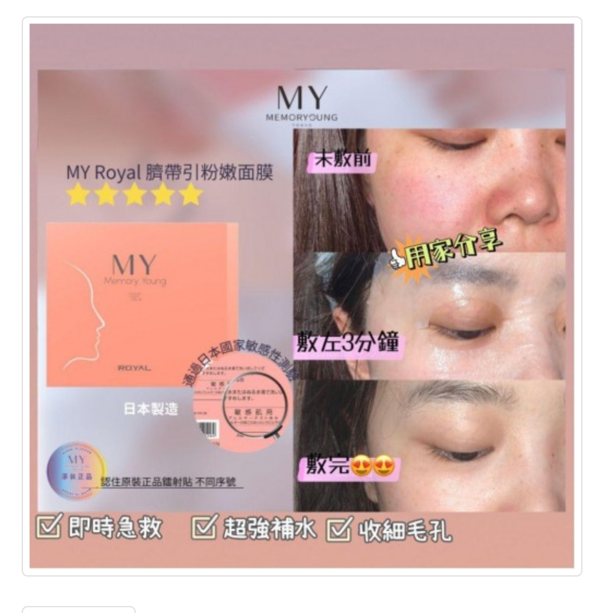 5086933842788352MY Royal 臍帶引素顏粉嫩精華面膜 一盒5片 Thanksgiving 快閃團 MY Royal 臍帶引素顏粉嫩精華面膜 一盒5片 🤗預訂價 $138 ‼️售完即止‼️ ✅️訂貨大約四至六個星期左右 日本東京 研究所 研發 🉐🉐🉐 敷一張= 你用左廿幾包精華 特選嘅面膜布 令30ml 精華滲透真皮層 刺激膠原bb👶👶 極速舒緩 👏👏 收 Product #: thanksgiving-MY Royal 臍帶引素顏粉嫩精華面膜 一盒5片 https://thanksgiving.boutir.com/i/SEooUsgAA 2026-12-15 Regular price: $HKD$138.0 Available from: ThanksgivingIn stock